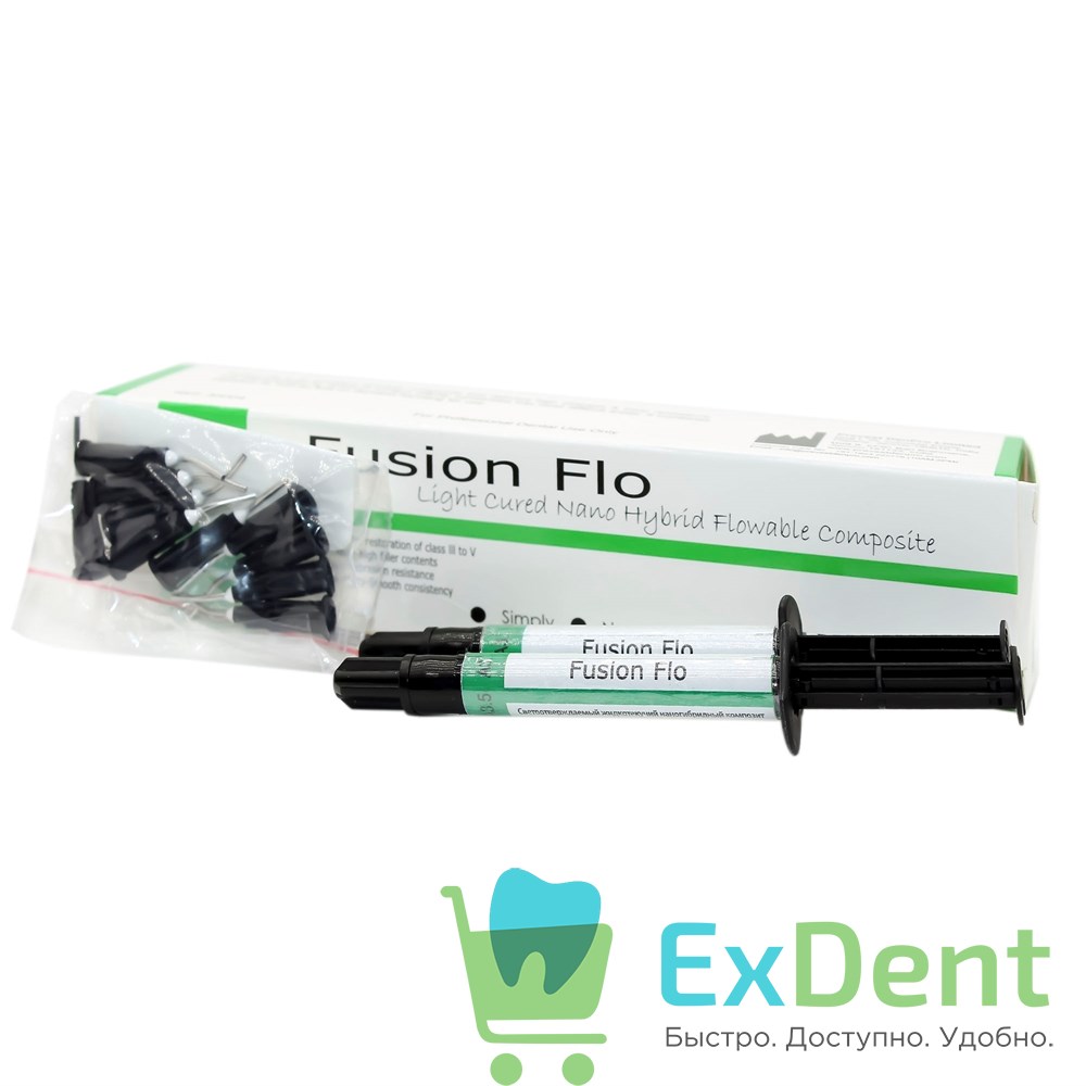 - Fusion Flo это фотополимерный композит для прямых реставраций,так же для цементировки композитных или керамических вкладок.Содержится в шприце для прямого нанесения