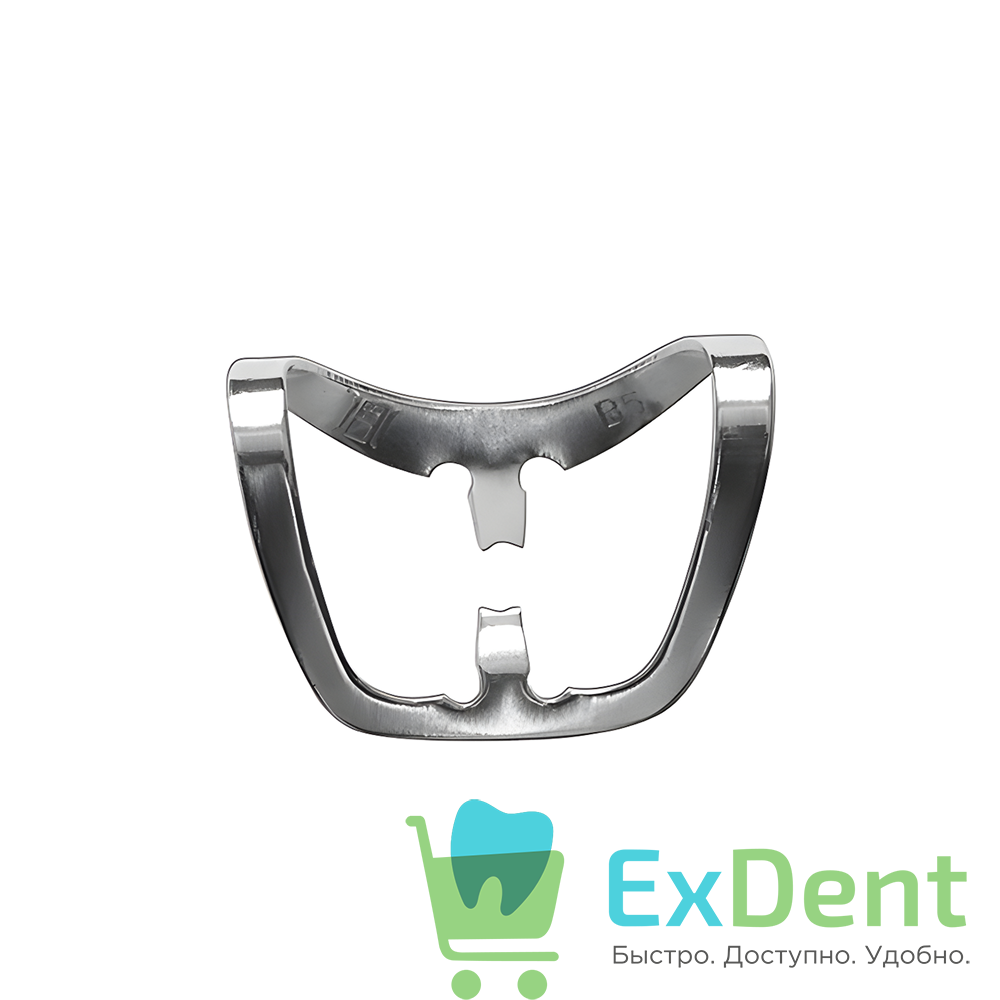 - Узкие "челюсти": Ключевая особенность клампа № B5 — зауженные щечки, которые обеспечивают доступ к пришеечной области зуба, не перекрывая зону реставрации и не травмируя десневой край. Это особенно важно при работе с дефектами V класса.