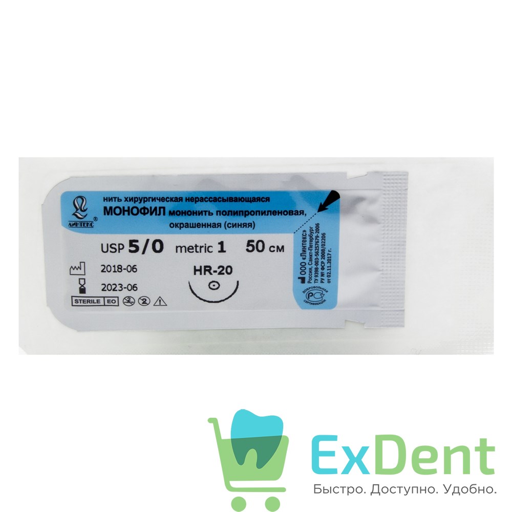 Шовный материал Монофил USP 5/0, metric 1, HR-20 колющая, 50 см - нить хирургическая