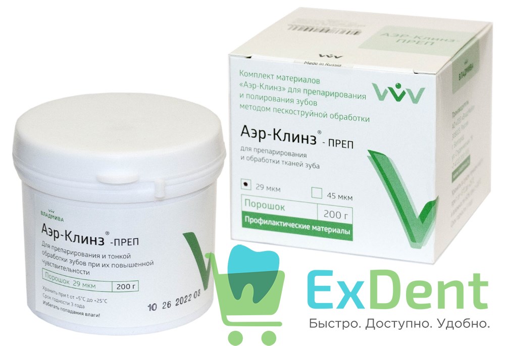 «Аэр-Клинз-ПРЕП 29 мкм» - размер частиц (29 мкм) и твёрдость абразива позволяют препарировать некариозные поражения зуба, проводить подготовку фиссур перед их герметизацией, а также механически создавать шероховатость в полости зуба для усиления адгезии реставрационных материалов к твёрдым тканям зуба.