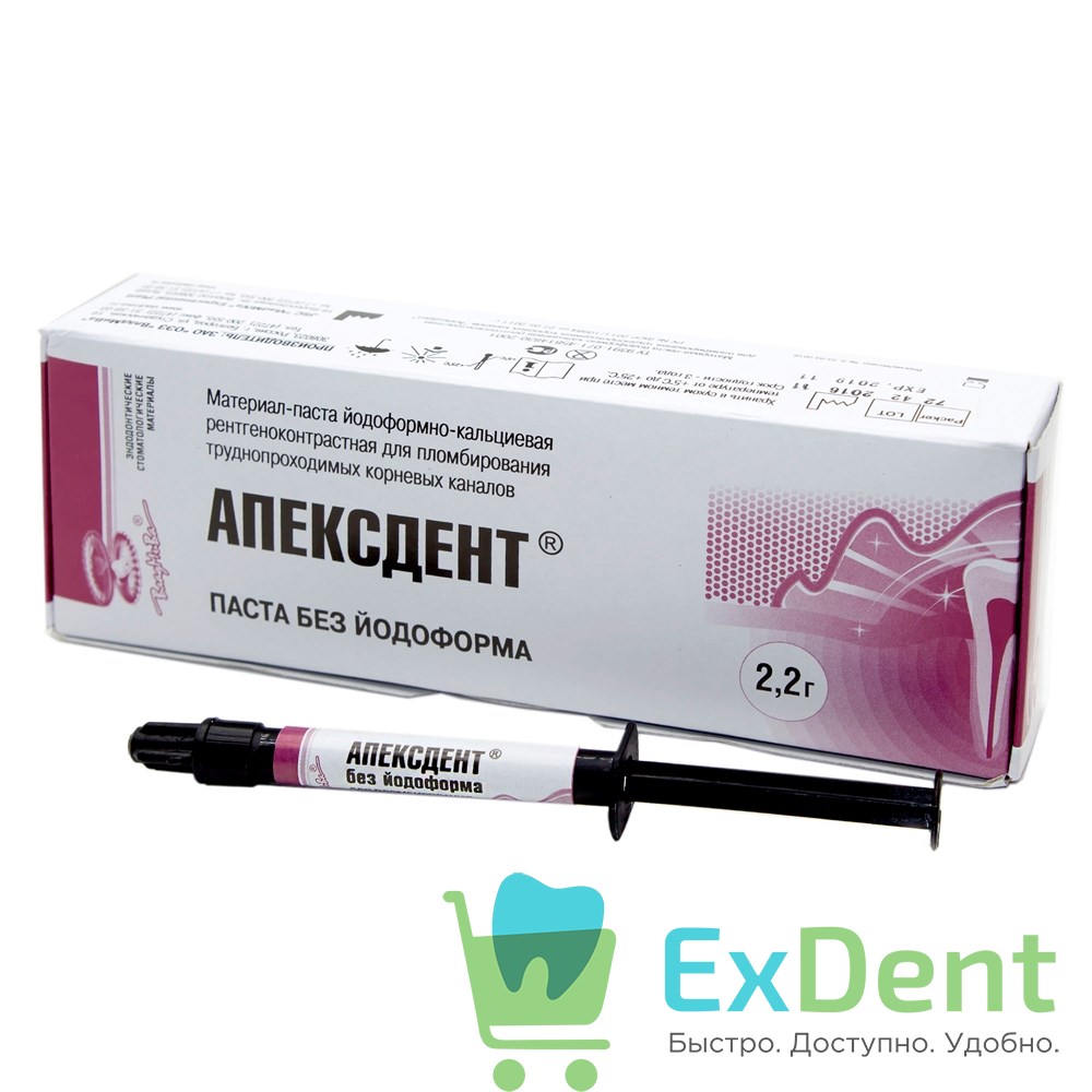 Стоматологический материал «Апексдент» БЕЗ ЙОДОФОРМА выпускается в виде готовой к применению рентгеноконтрастной пасты. Входящая в состав гидроокись кальция создает высокий уровень рН среды (12,5), обеспечивает стойкий, продолжительный бактерицидный эффект воздействия на оставшуюся пульпу зуба и\или систему макро- и микроканалов а, также в периапекальной области, приводит к образованию дентинно-цементного барьера, создавая условия для роста и формирования корня зуба, восстановления костной и периапекальной тканей.