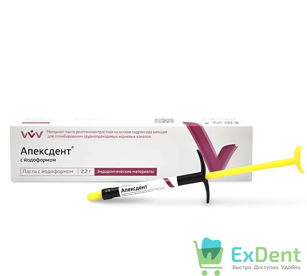 Стоматологический материал «Апексдент» С ИОДОФОРМОМ выпускается в виде готовой к применению пасты в шприцах и относится к типу долготвердеющих материалов.
