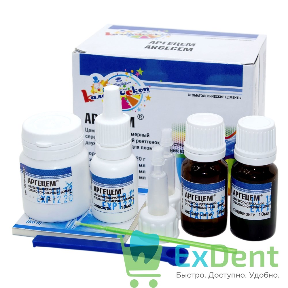 Стеклоиономерный серебросодержащий цемент Аргецем amp; образуется при смешивании порошка и жидкости. Порошок представляет собой измельченное алюмофторсиликатное стекло, модифицированное серебром, что повышает твердость цемента, устойчивость к истиранию, улучшает прочностные характеристики, обеспечивает рентгеноконтрастность. Жидкость amp;ndash;водный раствор полиакриловой кислоты.