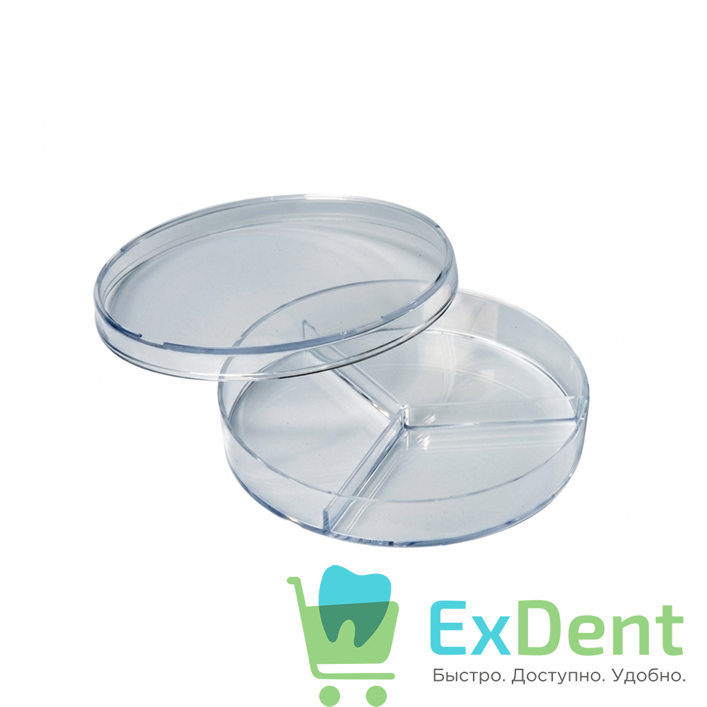 - Три изолированных отсека — физические перегородки внутри чашки создают три независимые зоны культивирования, что позволяет наносить три разные питательные среды или тестировать несколько образцов одновременно без риска перекрестного загрязнения. Это экономит до 70% лабораторного пластика и сокращает время на подготовку эксперимента.