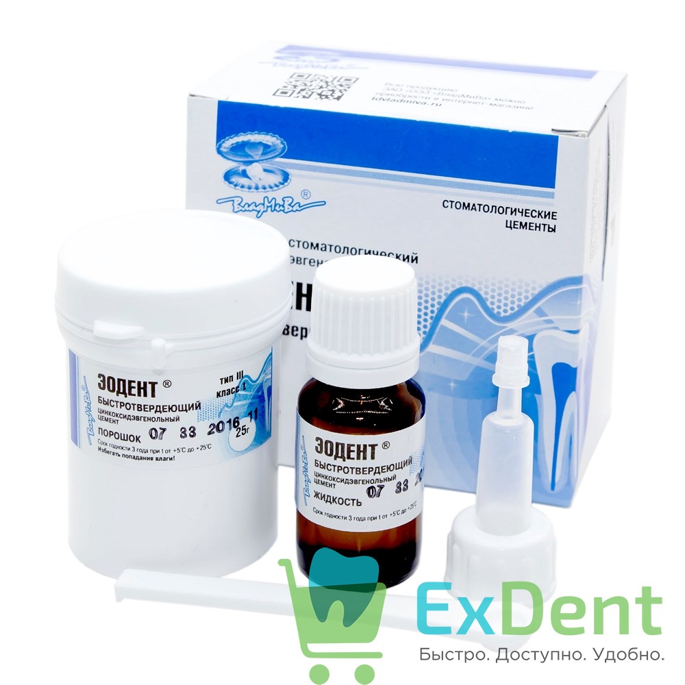 Цинкоксидэвгенольный стоматологический материал Эодент быстротвердеющий выпускается в комплектепорошок/жидкость. Порошок содержит окись цинка, гидроксиапатит, стимулирующий регенерацию костной ткани, ирентгеноконтрастный наполнитель.
