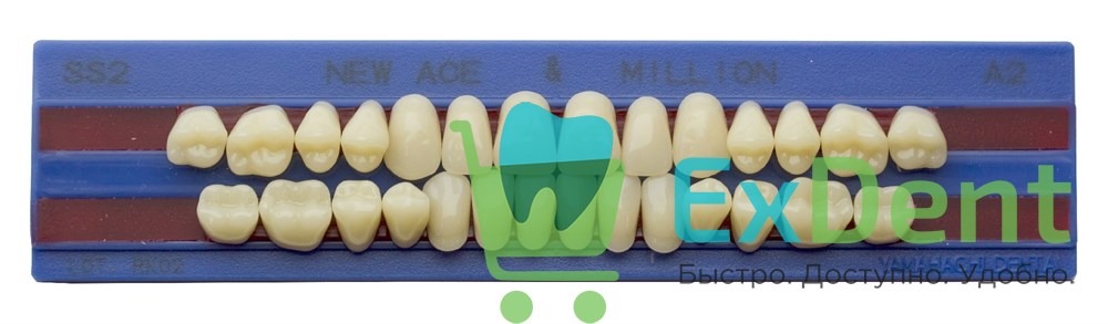 New Ace & New Million зубы акриловые двухслойные и однослойные, полный гарнитур, фасон SS2/S3L M28, цвет A2, 28 шт., фронтальные двухслойные New Ace, верх - фасон SS2, низ - фасон S3L, боковые однослойные New Million - фасон M28