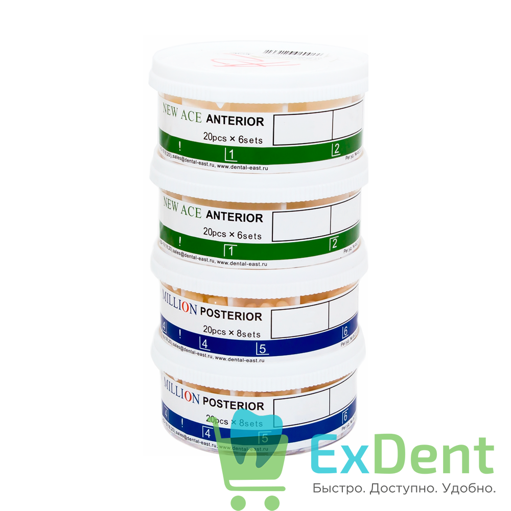 - Фронтальные верхние зубы New Ace (6 шт.) — двухслойные акриловые, фасон T2.