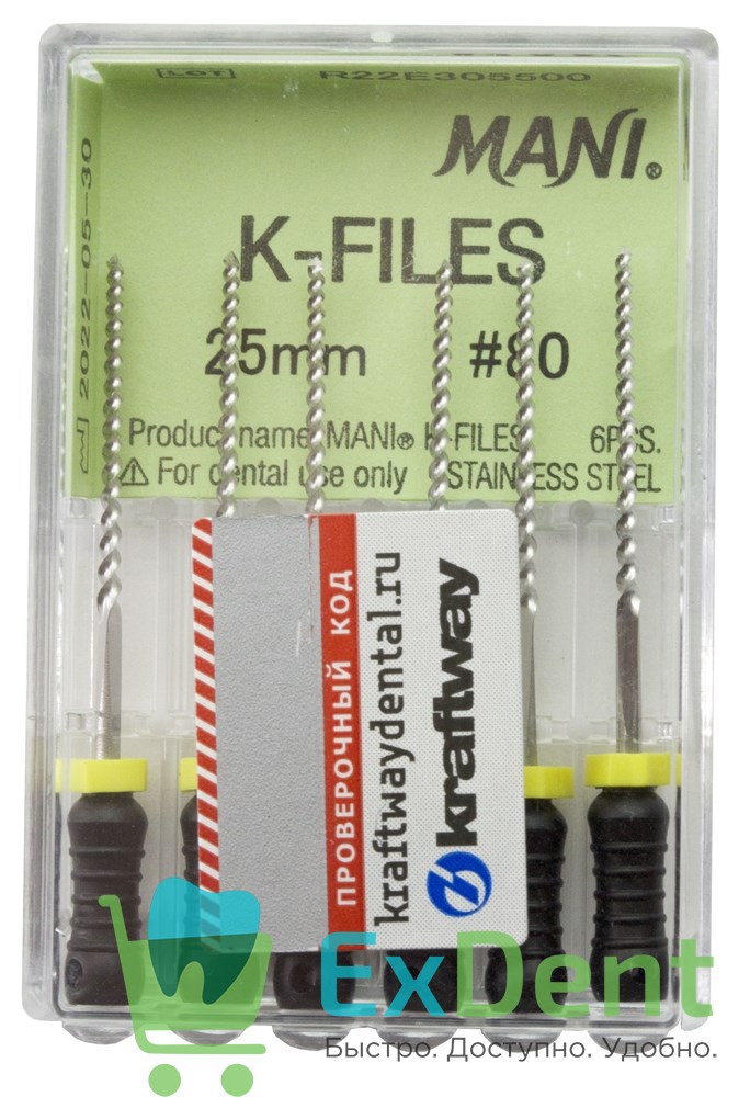 - 6 штук одной длины 25 мм, размер 80. Mani K-Files.
