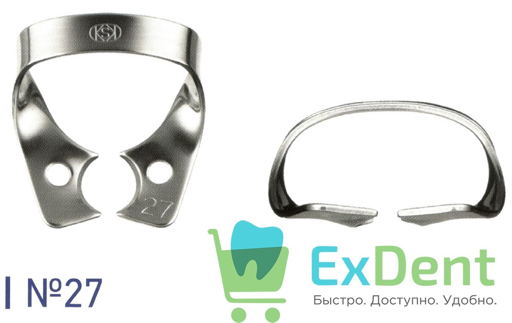 №27 Полированная сталь Кламп для клыков и премоляров верхней и нижней челюсти, для зубов с сильно разрушенной или отсутствующей коронковой частью. Щечки имеют воронкообразный изгиб в апикальном направлении.