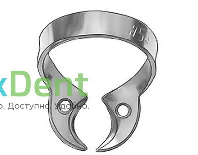 Кламп №W56 с жесткими изогнутыми челюстями (с глубоким захватом), без крыльев, для нижних моляров с большим размером коронки, могут быть использованы при сильном разрушении коронки зуба.