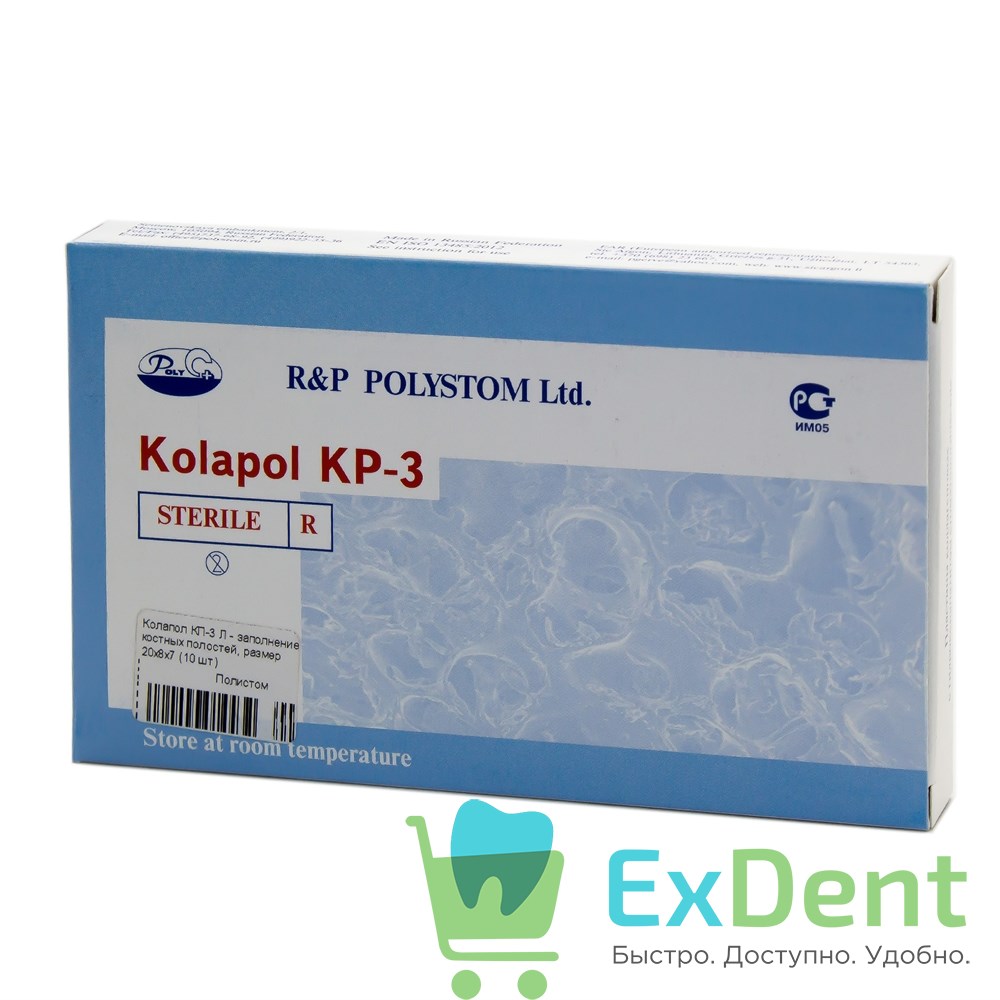 - Колапол КП3 стерильно (20 х 8 х 1,8) 10 шт - в хирургической, ортопедической и стоматологической практике для заполнения костных полостей, возникающих после удаления кист, псевдоопухолей, секвестрэктомии, у ранее неоднократно оперированных больных хроническим остеомиелитом (в том числе с осложненным патологическим переломом).