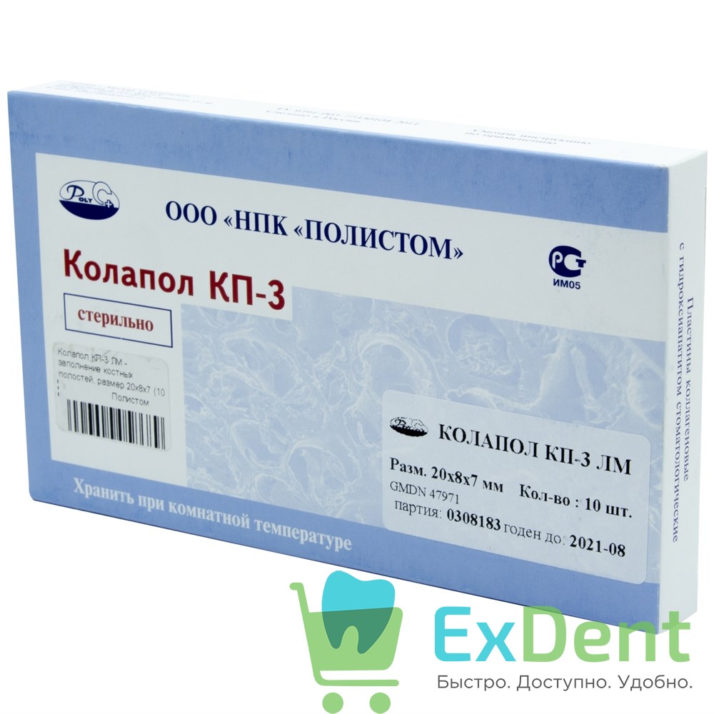 - Колапол КП3 стерильно (20 х 8 х 1,8) 10 шт - в хирургической, ортопедической и стоматологической практике для заполнения костных полостей, возникающих после удаления кист, псевдоопухолей, секвестрэктомии, у ранее неоднократно оперированных больных хроническим остеомиелитом (в том числе с осложненным патологическим переломом).