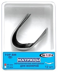 Матрицы металлические предназначены для разделения аппроксимальных поверхностей соседних зубов и контурирования пломб при работе с современными композиционными материалами. Матрицы изготавливаются из специальной коррозионностойкой стали. Матрицы металлические контурные характеризуются высокой анатомичностью форм, обеспечивают идеальные условия для восстановления контактных областей. Выпускаются толщиной 35 и 50 мкм. При заказе в скобках после номера указывайте толщину