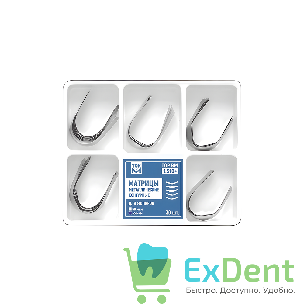 Металлические контурные матрицы для моляров ТОР ВМ (набор 5 форм, 35 мкм, 30 шт) — это профессиональный стоматологический инструмент, предназначенный для восстановления контактных поверхностей жевательных зубов. Матрицы изготовлены из специальной коррозионностойкой стали и обладают высокой анатомичностью форм, обеспечивая идеальные условия для восстановления контактных областей при пломбировании композитными материалами и амальгамой. Набор из 30 матриц толщиной 35 мкм включает 5 анатомических форм для всех клинических ситуаций на молярах.[reference:0][reference:1]