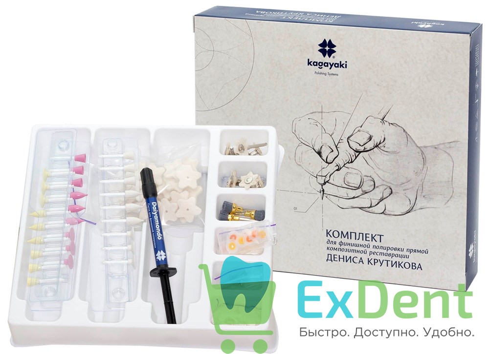 Комплект для финишной полировки Крутикова: Паста стоматологическая шлифовальная "Kagayaki Daiyamodo" 4 г., Полир "Kagayaki Enforce Pin", Полир Диск шлифовальный "Kagayaki RoundFlex".