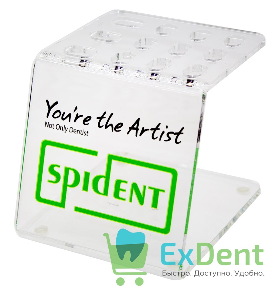 Фирменная подставка Spident, изготовлена из прочного оргстекла, удобная в использовании, силиконовые ножки позволяют надежно зафиксировать расположение на рабочем месте, вмещает до 12 шприцов.