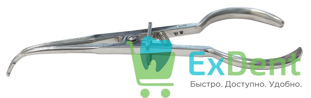 Стальные щипцы для установки клампов удобно фиксируются в ладони и надежно удерживают в растянутом положении любой кламп. Для снижения физической нагрузки в процессе установки клампов на изолируемые зубы, на щипцах имеется рамка-фиксатор, свободно передвигающаяся по ручкам щипцов между их изгибом и центральным фиксирующим винтом.