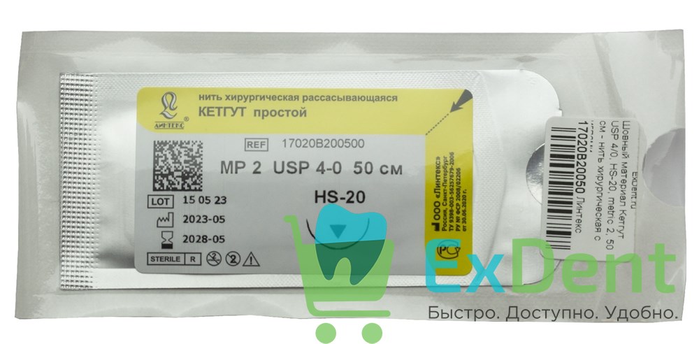 Шовный материал Кетгут USP 4/0, HS-20, metric 2, 50 см - нить хирургическая с иглами