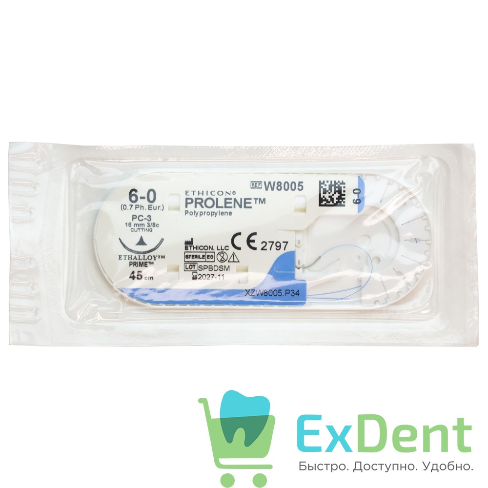Шовный материал Prolene (Пролен) синий 6-0, 45см, 1 игла, P-1 обратно-реж, 3/8 окр, 16мм