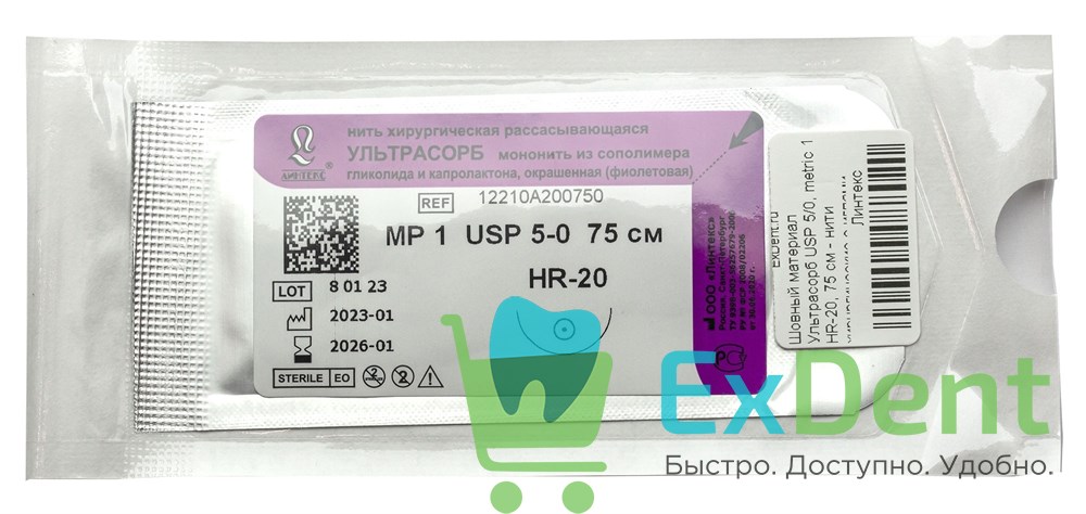Шовный материал Ультрасорб USP 5/0, metric 1, HR-20, 75 см - нити хирургические с иглами