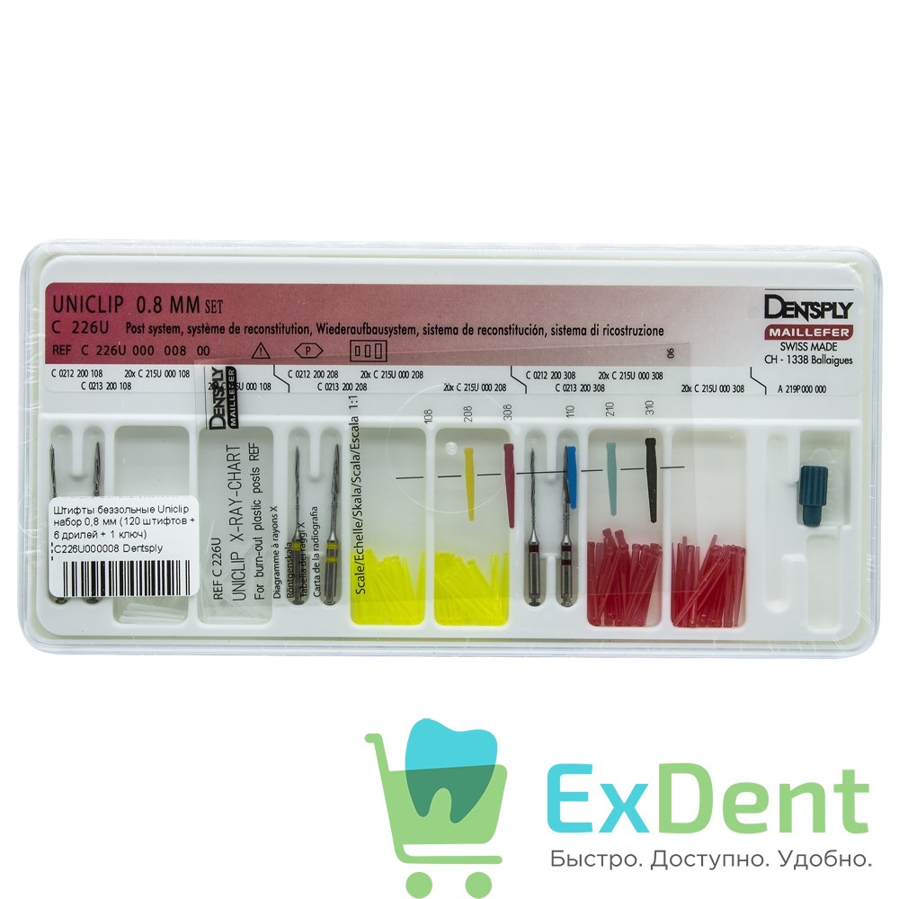 Штифты беззольные Uniclip набор 0,8 мм (120 штифтов + 6 дрилей + 1 ключ)