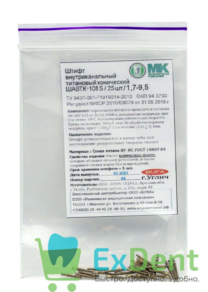 Титановые штифты выполнены из титанового сплава, обеспечивающего им исключительную прочность, легкость и полную биологическую совместимость с организмом человека. Этот материал по своим характеристикам прочнее стали, не подвержен коррозии даже в химически агрессивной среде полости рта, не образует опасных соединений, не вызывает аллергических реакций и обладает низкой теплоотдачей. Соответствие размеров и цветокодов маркировки торца привычным для врача стандартам создает дополнительное удобство при установке штифта.