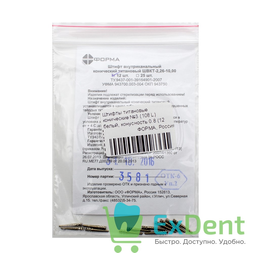 Штифты титановые конические №3 (108 L) белый, конусность 0.8 (12 шт)