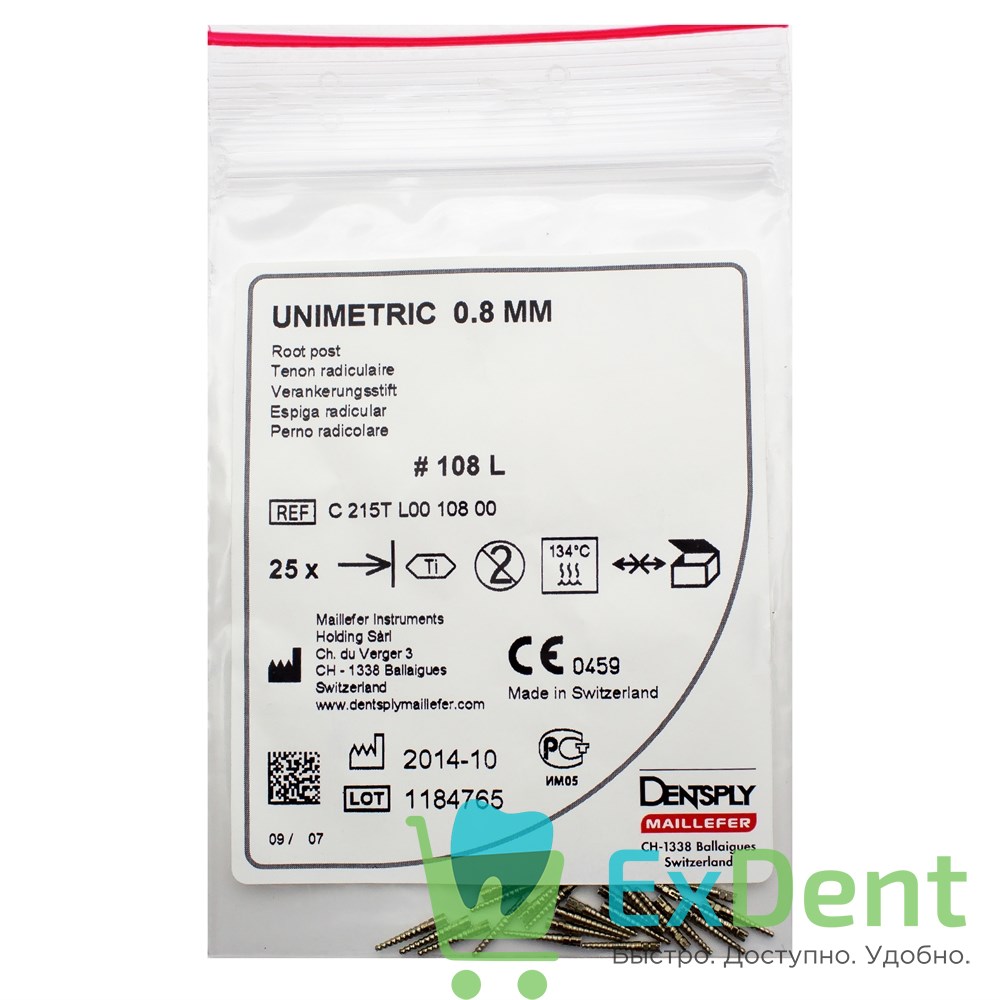 Штифты эндоканальные титановые Unimetric с диаметром внутрикорневой части 0,8 мм. Применяются в эндодонтии в качестве армирующего элемента для восстановления частично разрушенной коронки зуба пломбировочным материалом. Оптимально сочетают в себе цилиндрический и конический участки внутрикорневой части, что предотвращает раскол корня или его перфорацию в процессе установки и дальнейшего использования. Изготовлены из титанового сплава. 108 - длина корневой чаcти 7,5 мм, тип 108L - высота коронковой части 2,5 мм. Упаковка 25 шт.