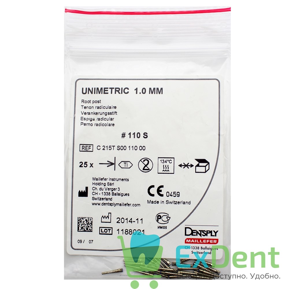 Штифты эндоканальные титановые Unimetric с диаметром внутрикорневой части 1,0 мм. Применяются в эндодонтии в качестве армирующего элемента для восстановления частично разрушенной коронки зуба пломбировочным материалом. Оптимально сочетают в себе цилиндрический и конический участки внутрикорневой части, что предотвращает раскол корня или его перфорацию в процессе установки и дальнейшего использования. Изготовлены из титанового сплава. 110 - длина корневой чаcти 7,5 мм, тип 110S - высота коронковой части 2,0 мм. Упаковка 25 шт.