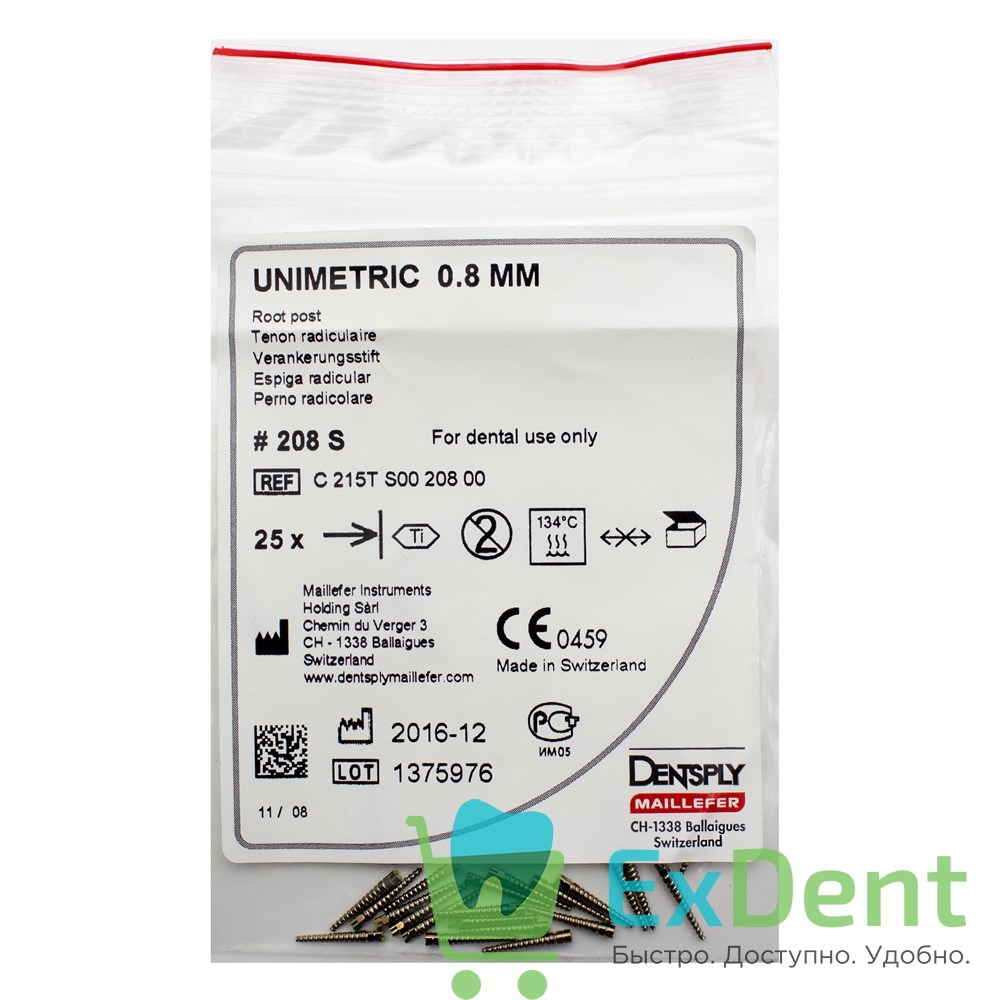 Штифты эндоканальные титановые Unimetric с диаметром внутрикорневой части 0,8 мм. Применяются в эндодонтии в качестве армирующего элемента для восстановления частично разрушенной коронки зуба пломбировочным материалом. Оптимально сочетают в себе цилиндрический и конический участки внутрикорневой части, что предотвращает раскол корня или его перфорацию в процессе установки и дальнейшего использования. Изготовлены из титанового сплава. 208 - длина корневой чаcти 9,25 мм, тип 208S - высота коронковой части 2,25 мм. Упаковка 25 шт.