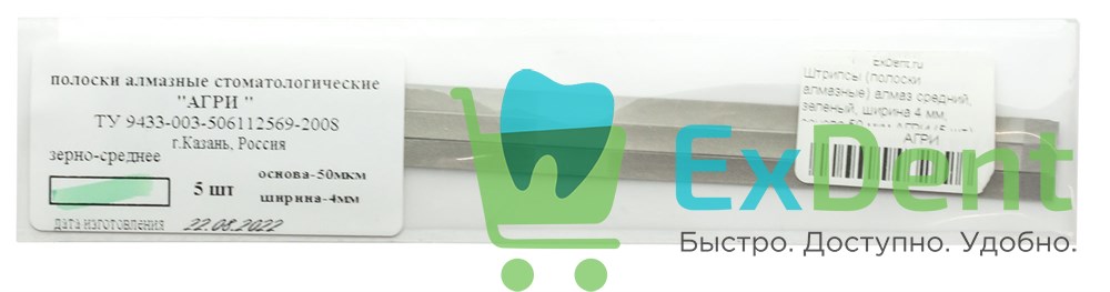 Полоски алмазные Агри . Применяются для препарирования межзубного пространства, удаления излишков пломбировочных материалов, формирования фальца. Абразивность средняя, Ширина полоски 4 мм, длина 150 мм. Упаковка 5 шт.