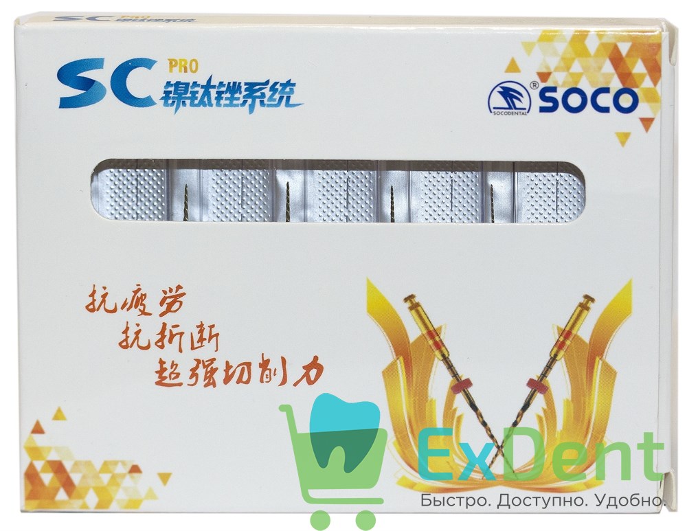 Машинные файлы с памятью формы из никель-титанового сплава для ротационного эндонаконечника Soco SC Pro - оригинальная разработка компании Soco. SC Pro так же, как и протейперы имеют режущую боковую грань, но в отличии от последних, за счёт феноменальной гибкости и отсутствия упругости точно идут по каналу, не выпрямляя его и сохраняя первоначальную форму. Отличаются возможностью запоминать форму, режущей боковой гранью и треугольным сечением. Как результат - безопасность в работе и полное сохранение анатомической формы канала. Модель SC Pro имеет специальное покрытие, дополнительно увеличивающее срок службы.