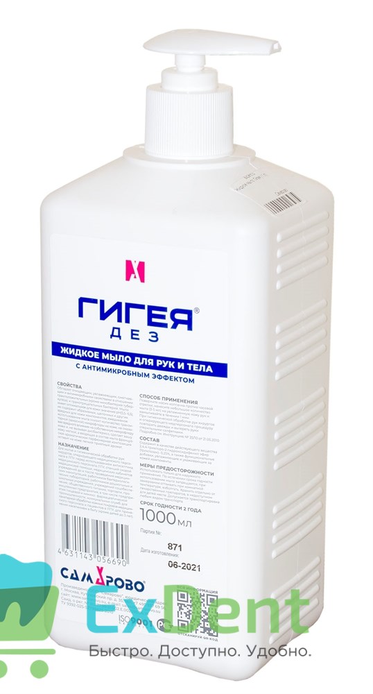 Назначение: для гигиенической обработки рук персонала и пациентов медицинских учреждений, работников пищевых предприятий и населением в быту.