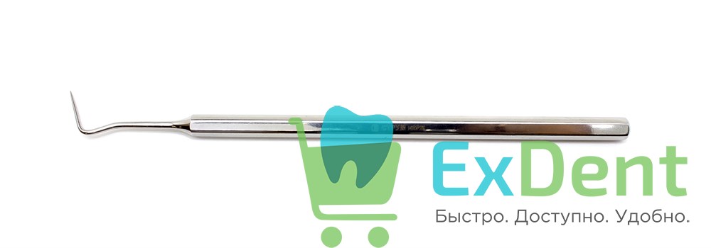 Изогнутый зубной зонд представляет собой цельное изделие длиной 155 мм, состоящее из шестигранной ручки и острозаточенной рабочей части.